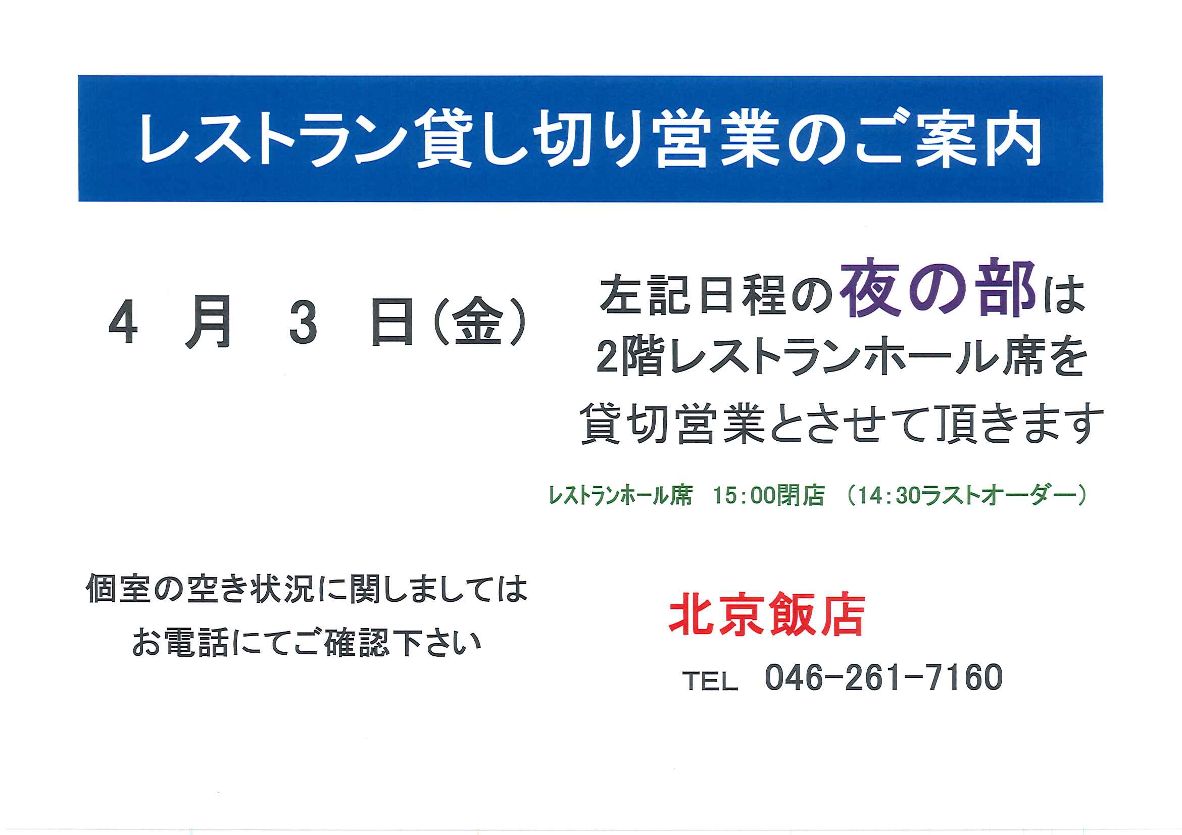 | 2026.03.05 | 4月の貸切営業のご案内 |